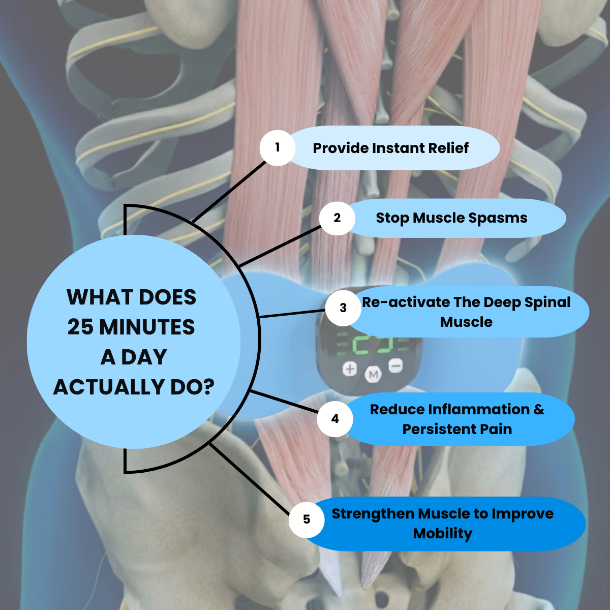The Lupps™ Pulse Pro uses clinic-grade AEMS technology to re-activate the multifidus — the deep spinal muscle that supports your back and core.